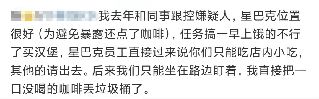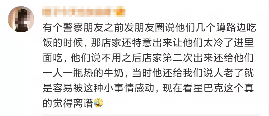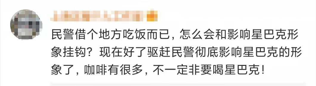 民警执勤,履职尽责,劳动强度大,工作时间长,往往无法按时就餐,也没有固定地点就餐,大都凑合一顿是一顿。民警应获得基本的尊重,而不是歧视。一定程度上说,星巴克也是民警执勤的获益者,对民警感谢还来不及,为何粗言相加?民警服务市民,服务公共利益,包括星巴克员工在内的人向他们提供“服务”,释放善意,难道不是应该?