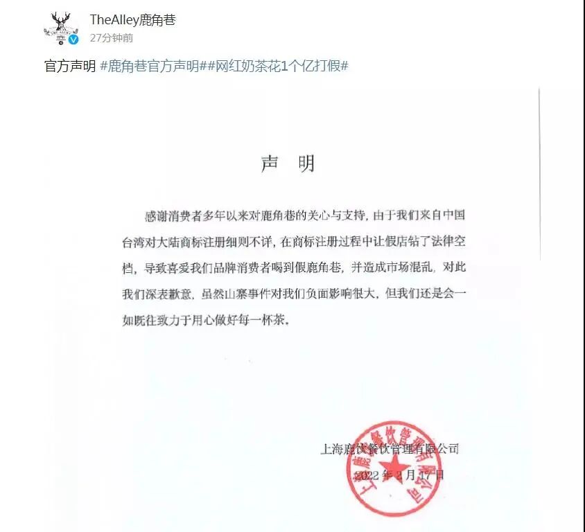 2月17日,报道中提到的奶茶品牌在其官方微博发布声明,表示“对商标注册细则不详,让假店钻了法律空档”,对此深表歉意。