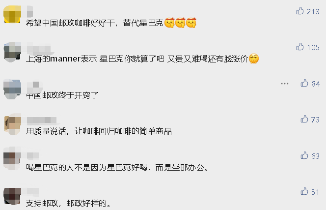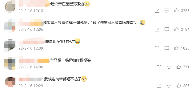 有网友表示:“建议开在星巴克旁边”,也有网友表示“邮局现在业务好广、我快连瑞幸都喝不起了”
