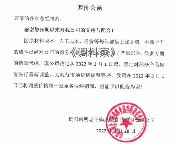 报道显示,一份“调价公函”称:“因原材料成本、人工成本、运费等每年都成上涨之势,不断上升的成本已经对公司的部分产品生产及备货造成了严重影响,经多方面慎重考虑,现公司决定从2022年3月1日起,确定对部分产品销售价格进行重新调整。”署名为:贵阳南明老干妈风味食品有限责任公司。