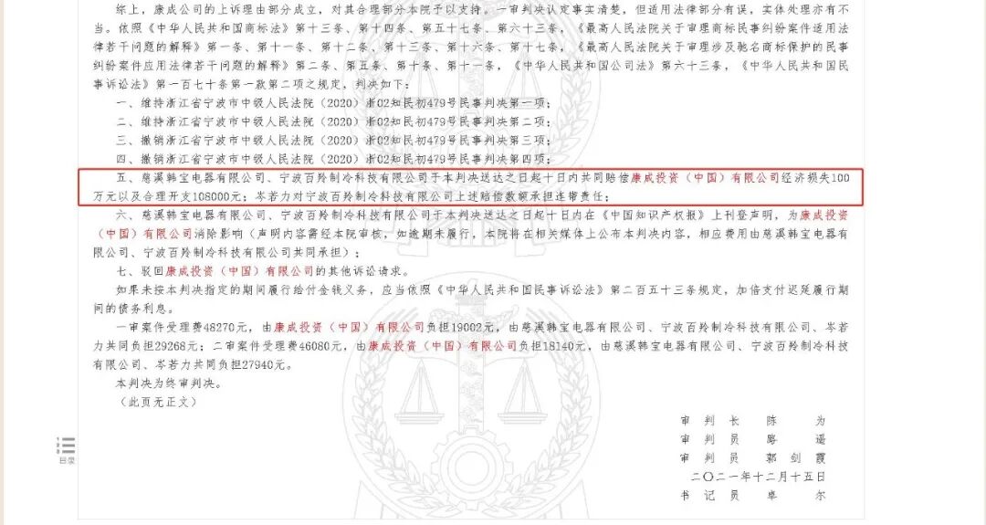 去年12月,该案得到了浙江省高级人民法院的二审判决,判定慈溪韩宝电器有限公司、宁波百羚制冷科技有限公司于本判决送达之日起十日内共同赔偿康成投资(中国)有限公司经济损失100万元以及合理开支108000元;岑若力对宁波百羚制冷科技有限公司上述赔偿数额承担连带责任。