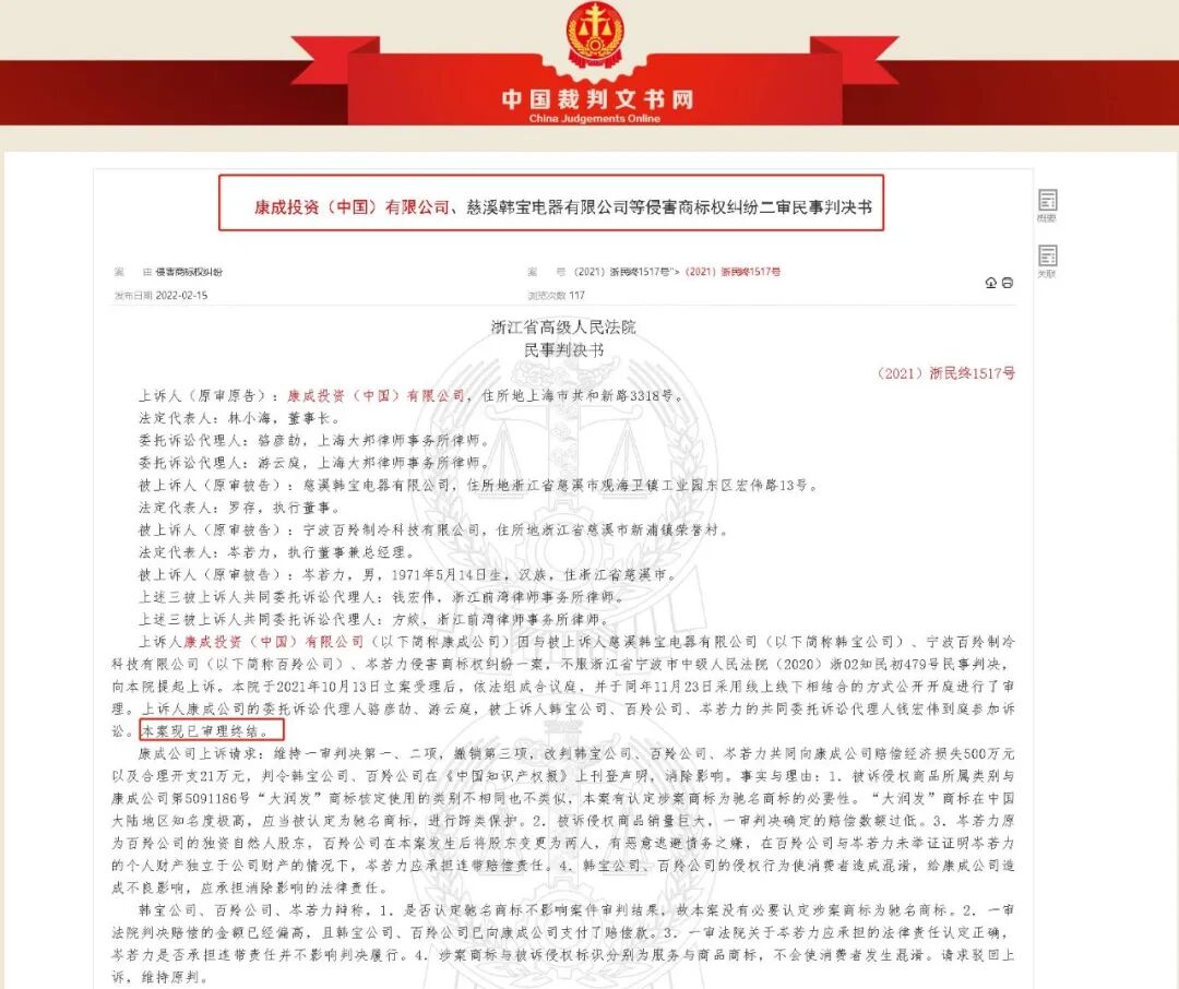 此外,还判定慈溪韩宝电器有限公司、宁波百羚制冷科技有限公司需在《中国知识产权报》上刊登声明,为康成投资(中国)有限公司消除影响。
