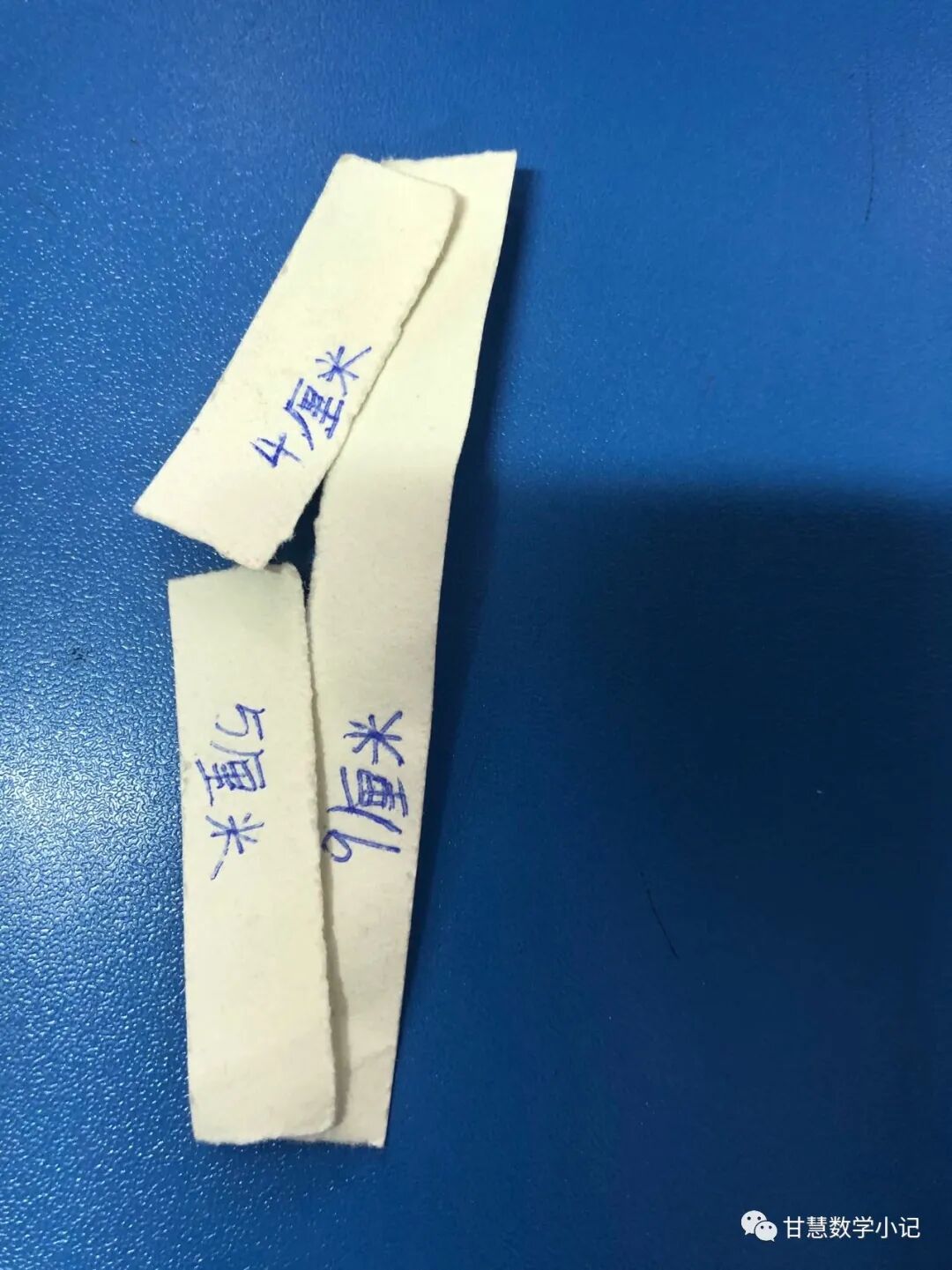 四年级下册学习三角形三边关系时,为了让学生动手操作自主探究三角形的三边关系,让学生准备了四组纸条(单位:cm)