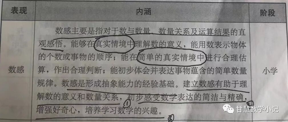 两个版本的数感进行比较,我们发现2022版课标对数感的定位更加具体。“数感主要是指对数与数量、数量关系以及运算结果的直观感悟”,这句话其实界定了“数感”这项数学核心素养概念的内涵,更突出“直观”。2022版新课标数感的第一个表现是“能够在真实情境中理解数的意义,能用数表示物体的个数或事物的顺序”。这一点突出了数是对数量和数量关系的抽象。数感的第二个表现是“能在简单的真实情境中进行合理估算,作出合理判断”,这强调了估算在解决问题中的重要作用。数感的第三个表现是“能初步体会并表达事物蕴含的简单数量规律”。“用数表达规律”是第一次在“数感”的描述中出现,这样的表述使数量关系的内涵更加丰富和全面。一方面,数的大小反映了数量的多少,因此用数表示规律可以体现在量的多少的变化上;另一方面,在体会和寻找规律中,可以感悟数量之间的关系。