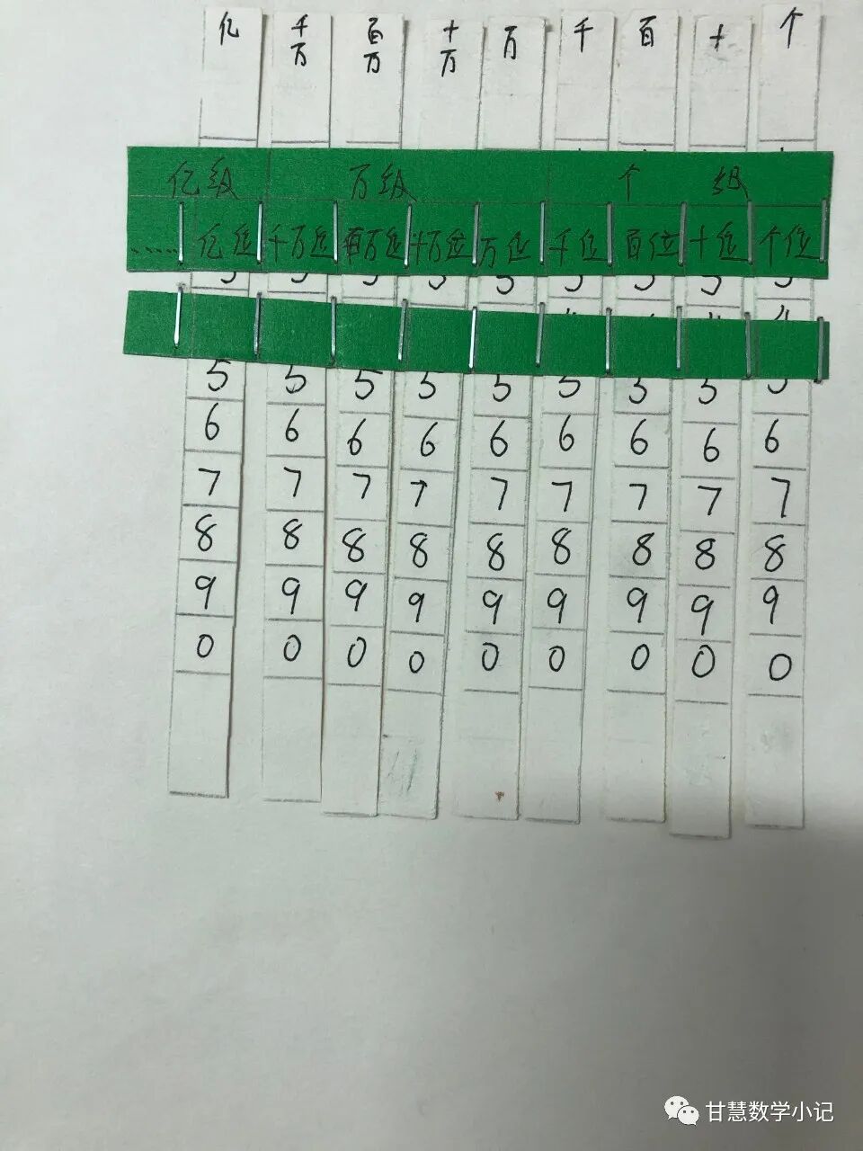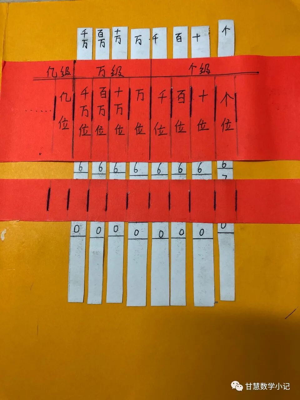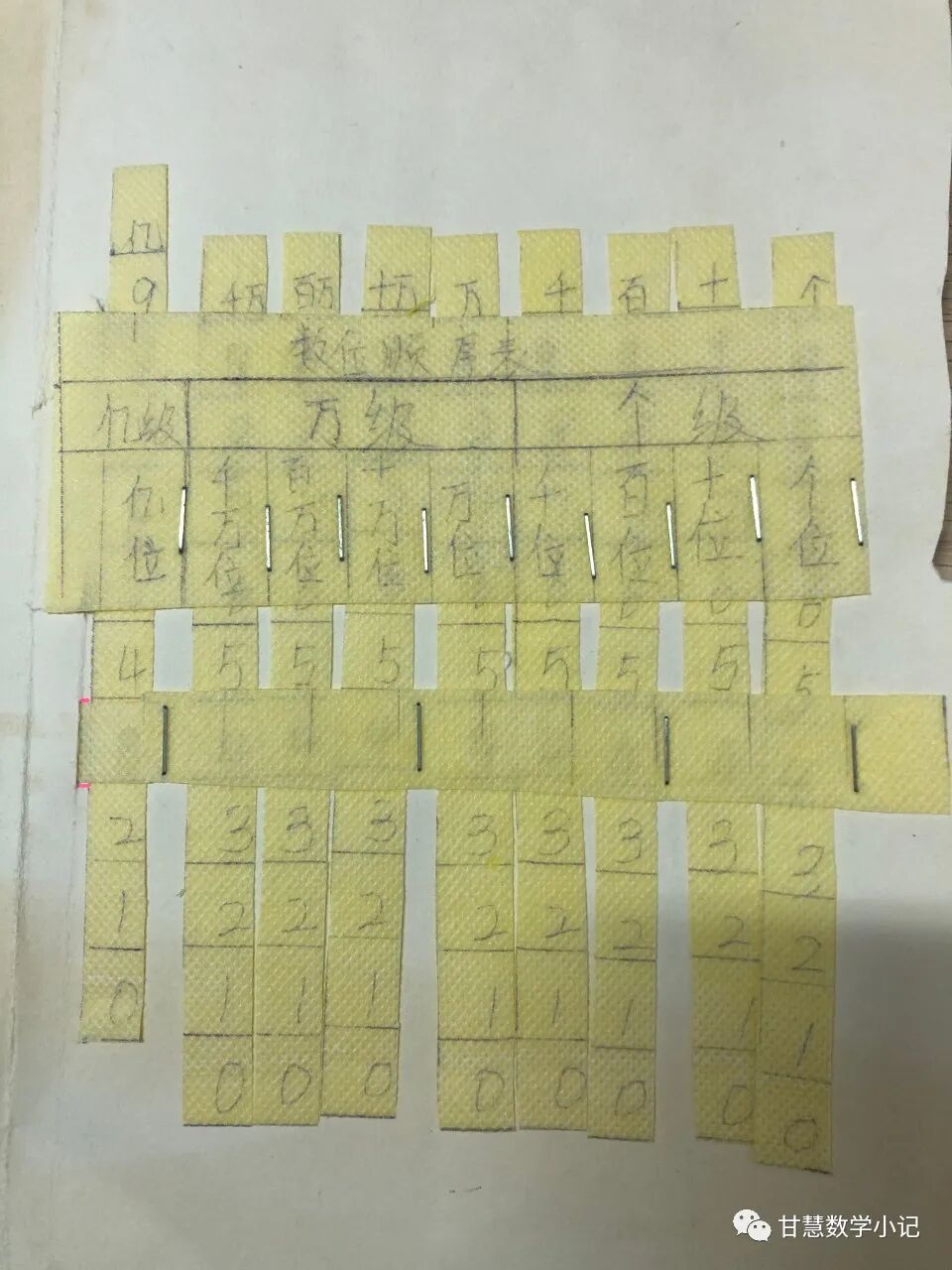 学习例1后布置动手操作作业:参考课本第3页制作数位顺序表,并在表的下面贴上一张白纸或连接几排插袋,方便进行读数、写数的练习。