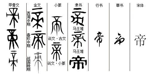 “帝”dì,象形指事字,‘鳯’的简化字,‘帝’字最早见于商朝甲骨文。甲骨文的‘帝’字上部为羽冠,下部为‘隹’的简省,中间的‘—’为鸟翅膀。因孔雀不擅长飞行,因此,有的顶部加一短横,指‘上’或‘天’。造字本义:(天降)雄性神鸟,引申为‘雄性首领、雄性天神’;根据商人的世界观引申为‘历代商王’。