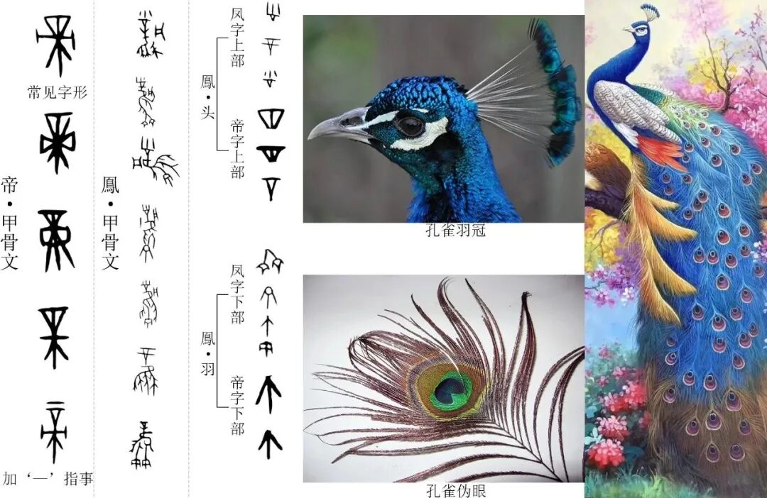 备注:对比甲骨文的‘帝’和‘鳯’不难发现:顶部都有相同的羽冠;甲骨文的多款‘鳯’字中表义雀鸟的‘隹’字下部都有‘朝下的三根毛’的图案,亦或是‘一个圆加三根毛’,这其实就是指孔雀特有的羽毛——‘孔雀伪眼’。‘鳯’字下方的‘孔雀伪眼’图案恰恰与‘帝’字下方的‘个’字图案不谋而合。甲骨文的多款‘帝’字意味着多个商族团体背井离乡时,凭借印象绘制的不同版本。‘鳯’是商人依据孔雀创造的神鸟形象,但其笔画甚多,很难书写或契刻,商人便在‘鳯’的基础上后造‘帝’来简化。