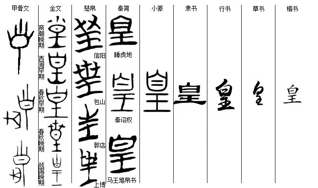 从商朝晚期至西周早期金文来看,‘王’字上部的图案更符合孔雀头与羽冠的结构。春秋、战国时期的金文在‘羽冠’处略有饰笔,但整体结构承袭前朝。战国楚简的‘皇’字将上部‘羽冠’讹变作两三个‘+’,尚可视作王冠的异形;睡虎地秦简则将‘皇’字上部‘羽冠’突出的三撮饰笔淡化,但应属个例;秦诏权及汉初马王堆帛书中的‘皇’字均承袭西周金文;西汉后期逐渐演变作‘从白从王’;东汉《说文》小篆讹作‘从自从王’,但隶书基本定型,写作‘从白从王’。造字本义:王冠,引申为‘侯国、方国首领’。