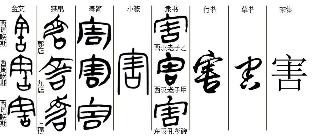 “害”hài,象形指事字,‘害’字目前最早见于西周晚期。西周金文的‘害’字由‘古’和‘罩子符号’构成,像套在车轮外侧的、车轴上的一种保护装置(车轴头),用来固定车轮,防止车轮窜位。楚帛、秦简承袭西周金文,东汉《说文》小篆承袭秦简,最终讹变作‘宀字头’的字,无法辨识。造字本义:固定车轮(的罩),引申为‘保护、固定、巩固、阻止’等。