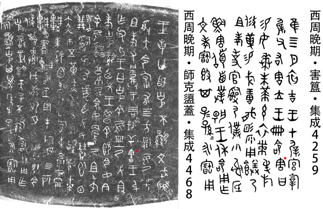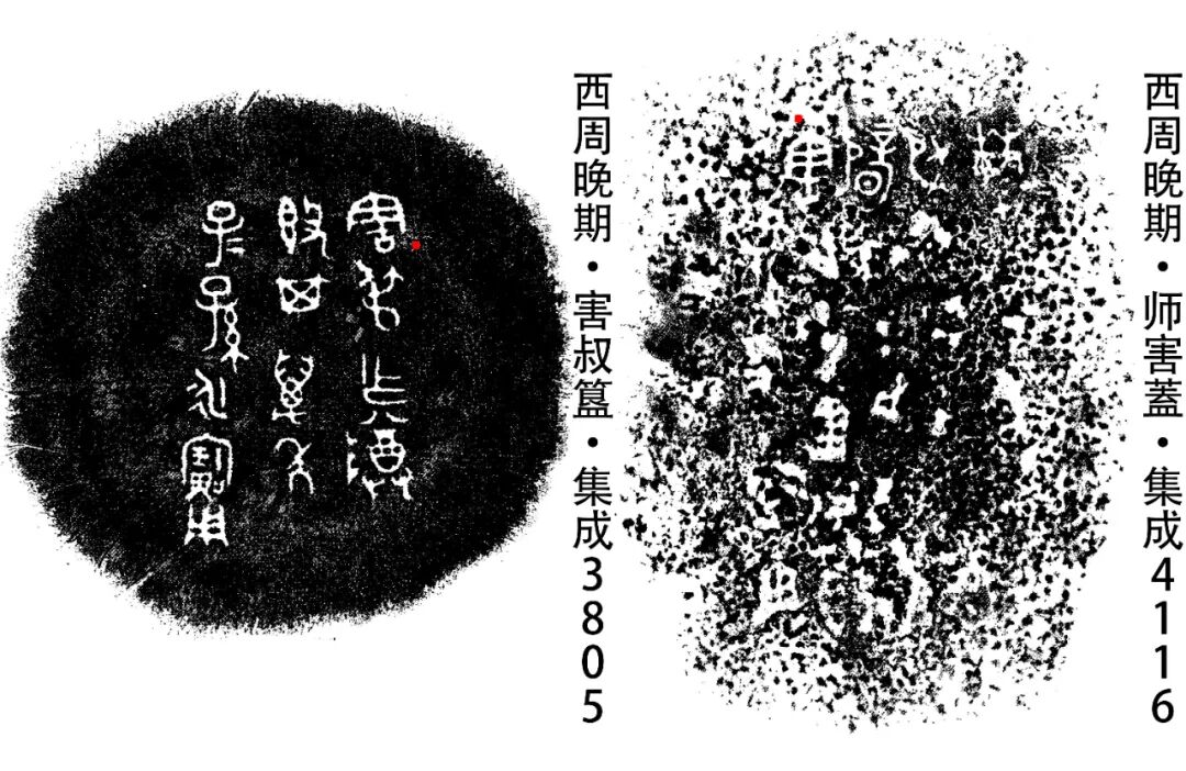 备注:西周晚期青铜器铭文中的‘害’字除用作人名外,还作“保护、固定、巩固、阻止”义。如「伯家父簋蓋」(4156):“用易害蛊”(用锡镀膜容器上的刻文)、「師克盨蓋」(4468):“干害王身”(捍卫、保护王)、「毛公鼎」(2841):“邦