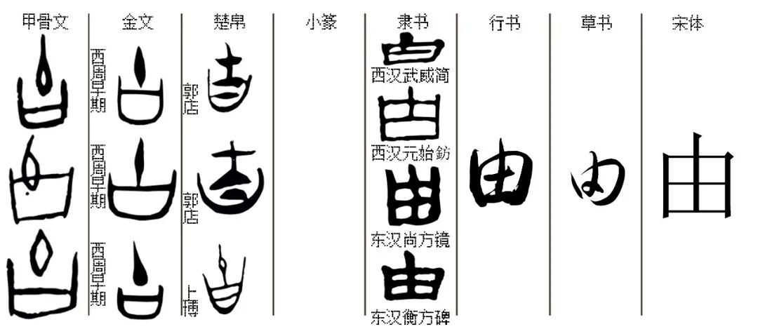像这样用动物脂肪灌注轮毂的事儿是不会记录在甲骨卜辞中的,但从商朝车具的复杂结构已经可以脑补了。‘由’同‘古’字一样古老,而且都与车具有关,像这样笔划少的一些字在商晚期逐渐引申出其他字义。