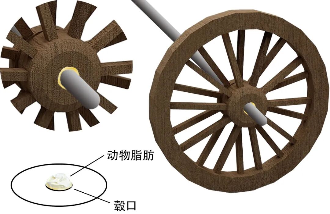 备注:目前最早记录车轮加油脂的文献是《诗经》,《诗经·国风·邶风·泉水》(节选):“出宿于干, 飲餞于言。載脂載舝,還车言邁。遄臻于衞,不瑕有害。”,此段的译文大致为:“在干地住宿,在言地用餐。抹好油脂、加固车轮,在言地掉转车头开始远行。疾驰前往衞国,顾不得会有妨害了。”