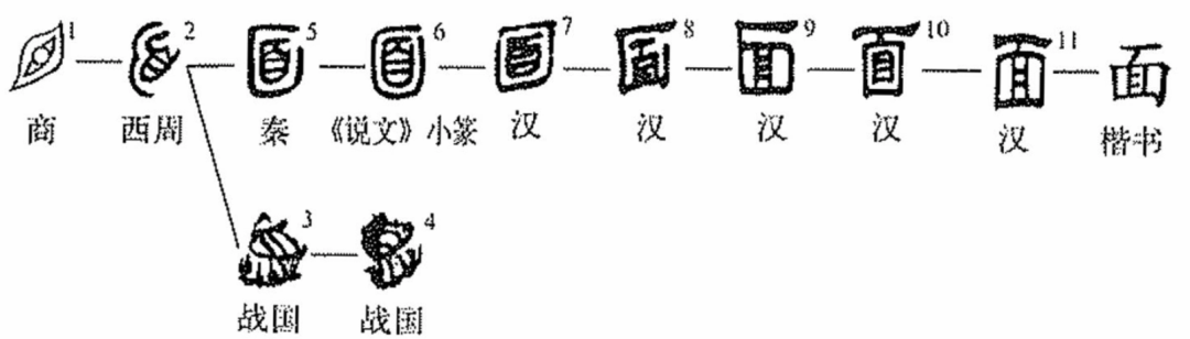 “面”,会意字。“面”的甲骨文作甲组图1,在“目”字的外围加一个框,表明那个范围内是人的面部。古人之所以用这两个构件造字,可能是因为眼睛是面部最引人注意的器官。战国竹简作甲组图3、4,省去了大半个框。面部在人头上,篆文把目字改为𦣻(首)作图5,把整个人头都框进去了。汉隶有的作图7,与篆文同构;有的作图10,外框多了两画;又作图11,目字变形,是楷书的直接来源。