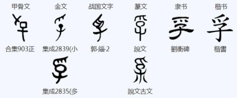 “孚”fú,这是一个会意字。甲骨文的“孚”字,左上方是一只手,其下是一个“子”,表明手抓“俘虏”之义。不过,这里所俘获的对象乃是“儿童”,即“子”。金文和小篆的“孚”字,大致上与甲骨文形体相似,仍然表示下手(爪)捉住了孩子。楷书的“孚”字,上部仍是一个“爪”字,只是写作偏旁,失去了象形的韵味。
