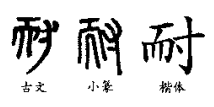 “耐”,会意字。秦简文的“耐”字,左边是一个“而”,在此表示颊毛;右边是个“寸”,像手中持物之形。两形会意,表示将颊须拔掉或剃掉的意思。小篆和楷书的“耐”与之一脉相承。