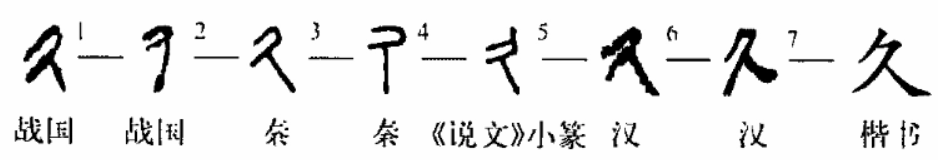 “久”,会意字。“久”是“灸”的初文。字形原是个侧躺着的人的身体(肉月),背部放置着一根艾柱正在进行治疗的样子。睡虎地秦墓竹简《封诊式》:“其腹有久故瘢二所。”后来“久”多借为“时间长久”义。后造“灸”替代“久”。