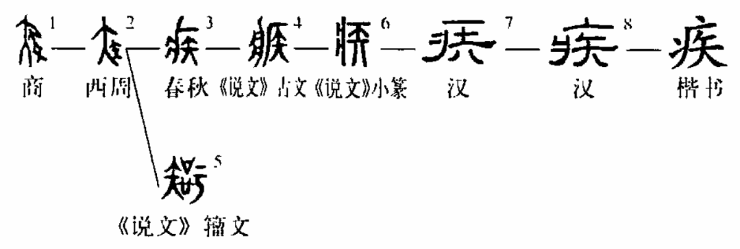 会意字。甲骨文由表示人的“大”和表示箭的“矢”组成(图1)。全字所描绘的是一只箭正好射中一个人的腋下,即一个人被箭射伤的情形。有的学者认为古人用箭伤来代指疾病,因此认为“疾”的本义就是“病”。王国维《观堂集林·毛公鼎铭考释》:“象人亦(腋的古字)下箸矢形。古多战事,人箸矢则疾矣。”古代战争很多,而弓箭是常用的武器之一,在战争中的人们经常被箭射伤,所以古人以为“疾”的初始意义是“箭伤”或“外伤”,由此再引申为“病、疾病”。“疾”字的金文(图2)保持了甲骨文的形体,从春秋时代开始,其结构发生了明显的变化:“疾”字中的人形被换成“疒”(nè)(图3)。许慎将小篆的“疾”说成是形声字,引起了不少人的怀疑。段玉裁作注时说:“矢能伤人,矢之去甚速,故从矢会意。”这就是说,小篆的“疾”仍然是会意字。“疒”甲骨文像一个人病后躺在床上之形,因此有学者认为“疒”为“病”之初文,再加上“矢”形而成“疾”,其意思应是由箭伤引起的疾病。《说文》古文中像人身躯形的一长竖和像床体的一竖尚未合一(图4),到了小篆里,两者就共用一个长竖了(图6)。汉隶中的“疒”最初还没有点(图7),这源自篆文。后来在一横之上加一点,变成“疒”了。
