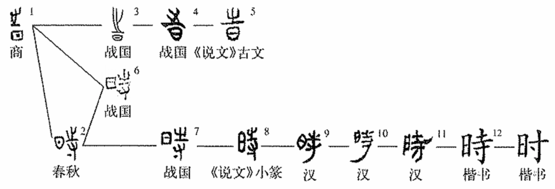 “时”,会意兼形声字,“時”的简体字。甲骨文中的“时”字写作图1,金文作图3,与《说文解字》所收古文“旹”相同。从甲骨文、金文到《说文》古文,“旹”字构形均从日从之。“日”为太阳,而“之”有行走之义,兼有表音作用。罗振玉先生《增订殷虚书契考释》说:“(之)卜辞从止、从一,人所之也。《尔雅·释诂》:‘之,往也。’当为‘之’之初谊。”由此可知“日”与“之”结合起来的含义是“太阳运行”。古人计算时间,总是根据太阳在空中运行的位置,或它在地上的投影运行的情况来决定的。古文“旹”可以说是古人测日以记时的见证。