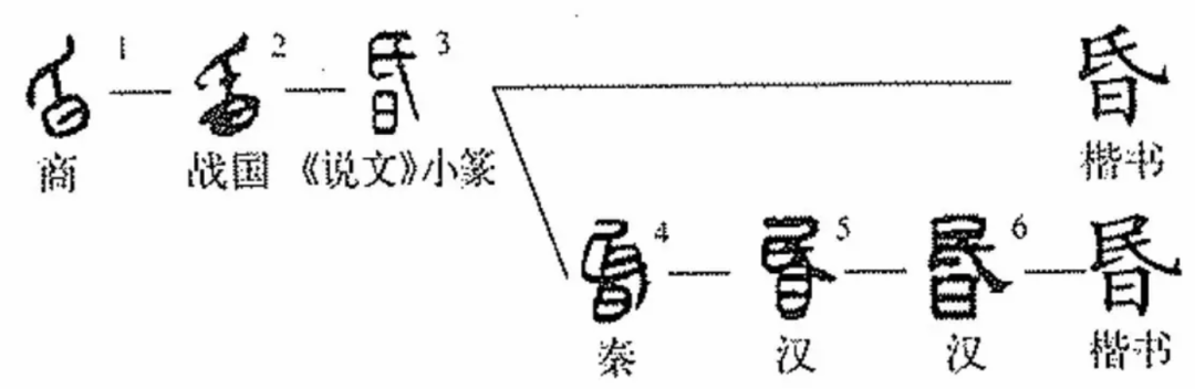 “昏”的字形学术界虽然还没有统一的意见,但是其本义的解说基本一致,即日落之时,黄昏傍晚时分。傍晚时日光暗淡,昏由名词引申为形容词昏暗、黑暗。《仪礼·士昏礼》:“凡行事,必用昏昕(xīn,天明)。”意为做事要抓紧时间,清早就要进行。昏又扩大指社会政治昏暗黑暗。如《道德经》第十八章:“国家昏乱,有忠臣。”光线暗淡,看不清物体,由此又引申为人对事物认识不清,昏愦,糊涂。如《诗经·小雅·小宛》:“彼昏不知,壹醉日富。”指斥那些糊涂不明智的人,整天喝得醉醺醺的,日益自满骄横。再进一步引申为昏迷,不省人事。如唐韩愈《董公行状》:“万荣病风,昏不知事。”