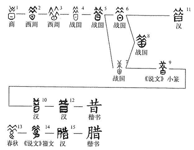 “昔”,会意字。初文从日,从巛。像洪水泛滥之意,所以“昔”的造字本义是指古代大洪水发生的时期。对于“昔”的字源的阐释,也有另一种不同的看法,许慎《说文解字》认为“昔”像在日光下晒制干(腊)肉条,说“昔,干肉也,从残肉,日以晞之。”有人会提出许慎在《说文解字》中对“昔”的解释来否定“昔”的本义是表示“过去”、“往昔”的概念。其实,即使“昔”的本义为“干肉”或“残肉”,也就是说这肉是以前的肉,也已经包含了一个“先前”概念。把肉晒干需要好几天时间,为了把干肉的意思表现得更明确,春秋时代又出现了一个图I的形体,在“昔”字下再加“月”(肉)作为干肉的专用字。腊肉的“腊(là)”也简化为“腊”了。这个“腊(xī)”字把下边的“月”(肉)放到“昔”的左边来了。