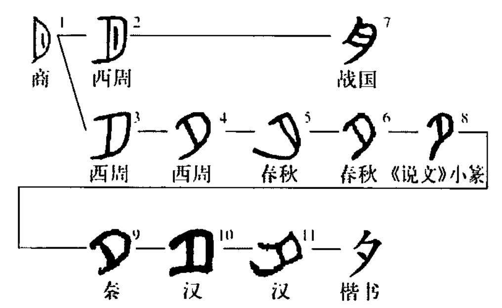 “夕”,指事字。商周时期,“夕”和“月”字形相同,都是月牙的形状,只是二者意义有分工。“月”指地球的卫星月球;“夕”则是夕阳西下、新月初升的时候,即黄昏、傍晚。到了金文(图2-6)阶段,月牙的轮廓开始变样,但字形字义还没有完全分化。到了小篆,“夕”和“月”才分化为两个音义都不同的字。月牙中加上一点的是“月”,没有加点的是“夕”。黄昏时看见的月亮,因为离地低,雾气多,折光大,不容易看到月中的阴影;当月亮升高时,它表面的阴影就会显现出来。故此“夕”这个月牙里便不加点,并以之表示黄昏之意。隶书以后,圆转匀称的笔画变得平直,并为楷书所承袭。