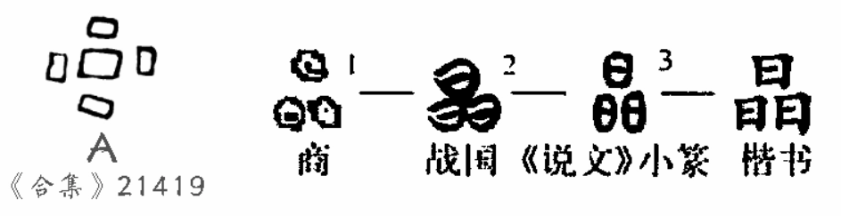“晶”,象形字。晶字甲骨文作图1,是三个略圆的“〇”,表示天上发光的物体。其实这是最古老的“星”的象形字。造字时不能只画一颗星,否则与日字混同,因此就画几颗星。甲骨文像三颗星,多者有四颗、五颗星,如图A。篆文作图3,三颗星完全变成了三个日字。《说文解字》:“晶,精光也。从三日。”许慎根据篆文直观,解为由三个“日”构成了。后来因为“晶”被借作“形容光亮”(如“晶莹”)“结晶”和水晶矿物用,才加声符“生”另造了“曐(后简化作星)”,把“晶”“星”二字区分开来。读音也由xīng变为jīng,x、j都是舌尖前音,发音部位相同,上古时同音。“晶”的本义是指星光,后引申为“明亮”、“闪耀”之义。