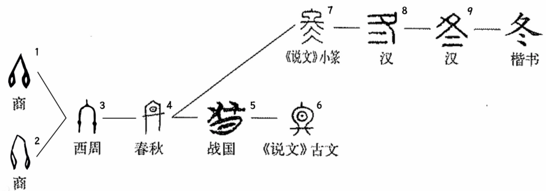 “冬”的金文写作图3、4。图3的金文“冬”字与甲骨文形体非常相近,但图4和甲骨文形体相差较大,这个形体像一个封团的房屋,屋内是一个太阳,大致表示太阳不出来,即天空无太阳照耀,用来表示冬天。《说文解字》收录的字头正篆的形体基于金文的形体进行了改造,金文形体中的“日”消失了,形体下面换作表示冰的部件“仌”,不见太阳而只见冰,就成了冰天雪地、滴水成冰的冬天了。“冬”字头下的古文形体,即图6,与图4的金文是基本一致的。后来为了书写方便,小篆体的上半部分变成了“夂”,而下半部分的“仌”简化成了两点,就是隶书和楷书“冬”字。