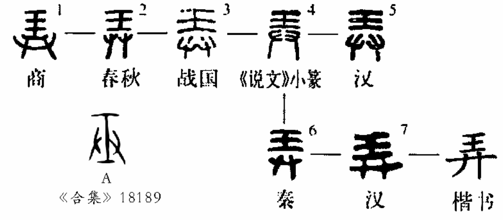 图A的甲骨文是否即弄玉的“弄”字还有疑问(《甲骨文编》、《甲骨文字典》释为弄)。图1是商代金文,下部像一双手(“廾”),上部从玉,指把玩的玉器。弄字指以双手把玩玉器。从金文到篆书,“弄”的字形变化都不大。所从的双手楷化为“廾”而已。值得注意的是,篆书玉与王都是三横一竖,差别只在前者第二横居中,上下等距离,后者第一、二横相距较近。楷书“王”字三横亦均匀分布,为相区别,乃于二、三横间之右侧加一小点作为玉石的“玉”字。但在合体字中,作为形旁的玉大都无此一点,与“王”无异,分析字形时需加辨别。明乎此,便知弄即弄玉,双手捧玉玩赏之谓也。