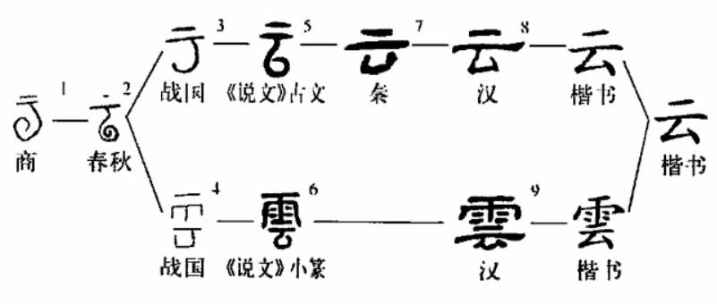 “云”由空气中的悬浮水气凝结而成,积久则变生为雨,重新回到地上。远在3300年前的殷商时代,从殷人卜辞中求雨于“河”、“岳”、“土(社)”、“方(四方之神)”的情况来看,殷人已模糊认识到云之生、雨之降,是由大地山川水气上升所致这一科学道理。战国以后,人们对气、云、雨之间的关系已完全明晰。所以,小篆的“云”字增加了“雨”字头,表明它与雨有关,也表明了东西周时期,农耕文化及功利主义在人们心头的凝聚。《说文解字》因而释为:“雲,山川气也。从雨,云象雲回转形。云,古文省雨。”这就是说,“云”乃“雲”在古代的简省体。