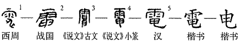 古文字“電”为会意字,。从雨,从申。清徐灏《说文解字段注笺》:“申,電也。‘申’的甲骨文象电光激射之形。”清王筠《说文解字句读》:“知申是古電字,電则后起之分别文。”本义是闪电。《说文》:“電,阴阳激燿也。”汉王充《论衡·雷虚》:“盛夏之时,雷電迅疾。”引申为物质中存在的一种能,人们利用它来使电灯发光,机械转动等。由闪电引申为像闪电一样的光亮。明屠隆《彩毫记·湘娥访道》:“火轮电光卫清都。”由闪电又引申为迅速。《宋书·王镇恶传》:“神兵电临。“電”现简化为”电“。