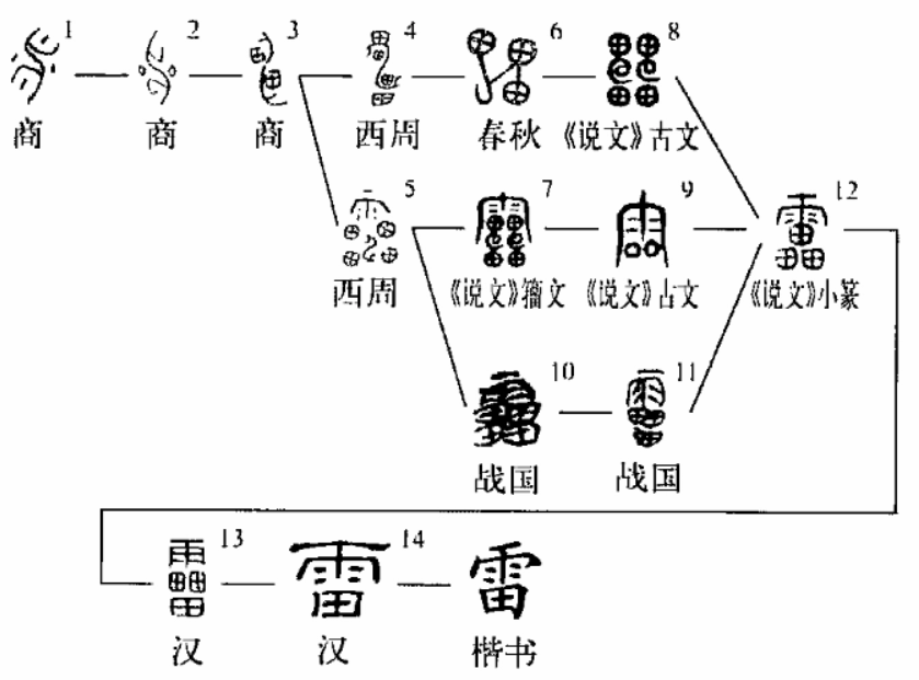“雷”,会意字,“靁”的简体字。甲骨文像闪电之形,中间的四个点先变为两个口,又变为两个田,表示闪电后发出的声响。金文闪电形变异,两个田变为四个田。西周晚期,金文“雷”字加形符“雨”,表示天下雨时发生的现象。小篆省略闪电形,又将四个田字简化为三个。隶书、楷书笔画化,把三个田字形简省为一个。本义是带异性电的两块云相接近时,因放电而放出的强大声音。《说文》:“靁,阴阳薄动,雷雨生物者也。“《诗·小雅·采芑》:”戎车啴(chǎn),啴啴焞焞,如霆如雷。“郑玄笺:”戎车既众盛,其声威如雷霆。“又引申为打雷。汉贾谊《旱云赋》:“云惟布而雷动兮,相击冲而破碎。”由打雷来比喻迅速。唐柳宗元《晋问》:“河渔之大,上迎涛波,罗壅津涯,千里雷驰,重马轻车。”又指一种爆炸性的武器。如:地雷;鱼雷,也简称“雷”。