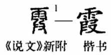 “霞”是形声字。字形采用“雨”做形旁。篆文从雨,表示与云有关。叚声。本义是日出、日落前后天空及云层上因日光斜照而出现的彩色光象或彩色的云。所谓的霞,其实是天空中彩色的云,在日出、日落时会出现的一种景象。唐王勃《滕王阁序》:“落霞与孤鹜齐飞,秋水共长天一色。”中用霞来比喻如彩霞般艳丽。《说文》文字(图1)。隶变后楷书写作霞。