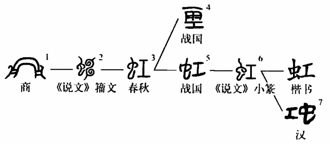 也许是书写困难的原因,这个甲骨文“虹”字没有流传下来,而是用其他字形代替了。图2是春秋籀文,从虫,从申,申的古字形模拟闪电。图3为石鼓文,这是个形声字,左部是虫(古人认为彩虹像虫);右部是工,作声旁,奠定了后世“虹”字左形右声的格局。战国文字有一异构作图4,从雨,工声。说明在战国时期,人们已经认识到,虹与雨水有关,虹是雨水折射太阳光而成的自然现象。但从雨作的“虹”字只是昙花一现,没有继续流传下来。从虫、工声的结构,后世还有左“工”右“虫”(𧈬)和上“工”下“虫”(𧈫)两种异体,前者见于马王堆帛书和《集韵》,后者收录于《正字通》等书,均比较少见。