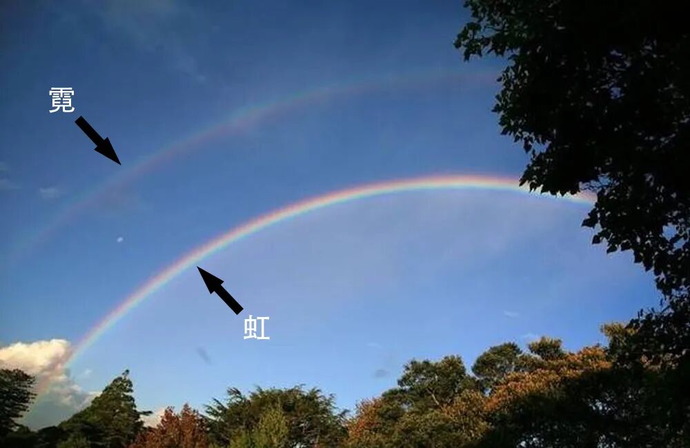 当一束太阳光射入一小水滴发生折射(色散)而在水滴内发生两次反射时,其在水珠中的传播如图1,折射率小的红光的出射光线方向与入射方向成 50.67°,折射率大的紫光的出射方向与入射方向成53.6° ,人眼根据视觉的直线特性而将观察到射出水滴后的光线在空中形成外侧成紫色而内侧成红色的彩色分布。由于太阳光经过水滴后发生两次反射的情况较发生一次反射的光能量损失很多,因而“霓”的亮度比“虹”的亮度暗得多,故又将其称作副虹,而且副虹位于主虹之上,副虹下面才是主虹。主虹中颜色的分布为外红内紫,副虹的颜色分布为外紫内红;人们通常观察到天空中的彩虹主要是主虹而副虹因为太暗一般不容易被人们观察到。