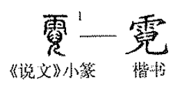 “霓”,形声字。从雨,兒声。大气中有时与虹同时出现的一种光的现象,彩带排列的顺序与虹相反,红色在内,紫色在外颜色较淡,也叫副虹。《说文》:“霓,屈虹,青赤,或白色,阴气也。”统而言之,霓亦即虹。唐李白《古风》之十四:“鼻息于虹霓,行人皆怵惕。”在真空管内充入氖等惰性气体,通电后可发出各种颜色的光,叫霓虹灯,多用作广告灯或信号灯。