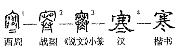 《说文》:东也。本作𡫾。从人在宀下,从茻荐覆之,下有仌。仌,水也。隶省作寒。《释名》:寒,捍也。捍,格也。《玉篇》:冬时也。《易·系辞》:日月运行,一寒一暑。《书·洪范》:庶徴曰燠,曰寒。传:焕以长物,寒以成物。