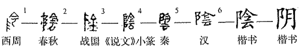 阴,原为形声字,“隂”的简体字。金文左边为阜,表示山地,作形旁;右边为侌(yīn),作声旁。篆文将金文字形中的“阜”写成“𨸏”。隶书将左边的“阜”写成“阝”。楷书笔画化。《说文》:“阴,闇也。水之南,山之北也。从𨸏,侌声。”一说阴字当从𨸏从云今声。云与阜皆遮挡阳光之大的物体,故从𨸏从云,本义为(qióng)也,引申指水之南,山之北阳光照不到之处。西周金文㠱伯𪾔铭文:“其阴其阳,以征以行。”正用水之南、山之北之意。今声,声中也含义。《汉字简化方案》用“月”(与“日”相对,表示没有阳光)代替繁体楷书字形中的“侌”(天空多云而没有阳光),另造会意字“阴”。