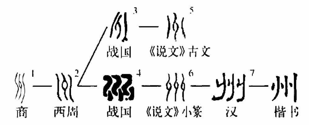 “州”,象形字。其甲骨文(图1)自上而下的三条曲线是“川”字,表示河流;中间的小圆圈,表示水中有块陆地。所以,“州”的本义是指水中的陆地。《诗经·周南·关雎》中有“关关雎鸠,在河之洲”的句子,这“洲”本来应该是写作“州”的,“在河之州”就是指在河中的一块小陆地上。金文(图2)的“州”基本上与甲骨文相同。小篆(图6)就复杂了。三支水流都加上了小陆地。而隶书(图7)、楷书为了书写方便,把三块小陆地变成了三个点,写成“州”。