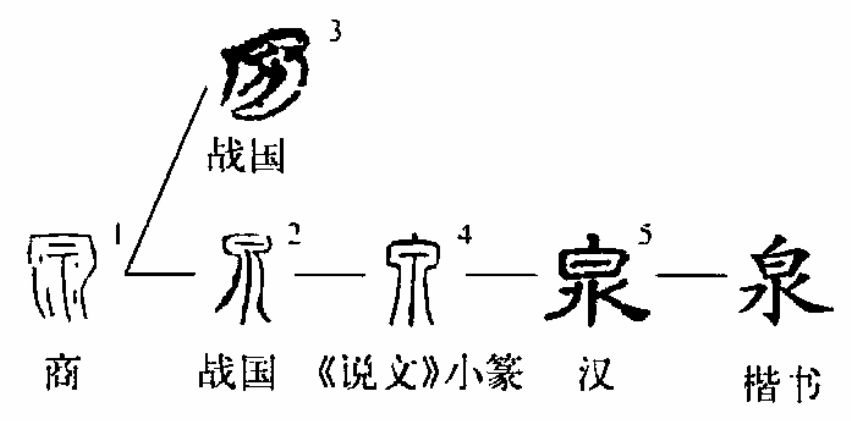 “泉”,象形字,“原”的本字。泉,甲骨文像石洞里细流涓涓。造字本义:出水的石洞,水流的源头。有的甲骨文将“水柱”形状写成“下”,强调山泉“飞流直下”的特点。楚帛书将石洞写成开放的。当“泉”字“出水的石洞”的本义消失后,金文再加表示石洞的“厂”另造“原”代替;当“原”的“水流源头”本义消失后,篆文又加“水”再造“源”代替。如“温泉、泪如泉涌、喷泉”等。小篆的“泉”字承接甲、金文字,楷书在隶变过程中,讹变为“从白从水”的会意字。