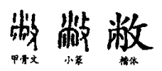 “敝bì”,会意字。甲骨文“敝”字的右半部,乃手持木棍之形,表示一个人手持棍杖在敲打;左边则是一个“巾”(巾帛)字,上下四散的四个点儿,为“巾”上的破洞或裂缝。小篆的形体与甲骨文基木相似。楷书的写法,秉承小篆而来。
