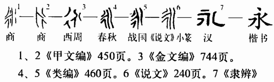 其字形像长长的流水,中间是主河道,旁边是支流。按这个意思分析,“永”的本义指水长流不断。金文(图3)的“永”字由甲骨文演变而来,只是右侧水形变成一条实线。小篆(图6)的字形与金文相似,都有水流不断的样子。楷书笔画化,失去原形,但字的下部为水,仍表示与水有关。