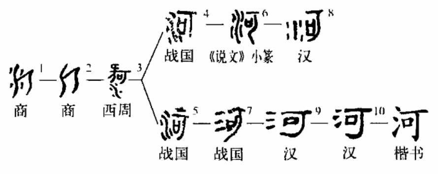 “河”,形声字。古音皆在歌部。战国文字省去人形作“可”,为小篆所本,遂为从水、可声的形声字。河,黄河。