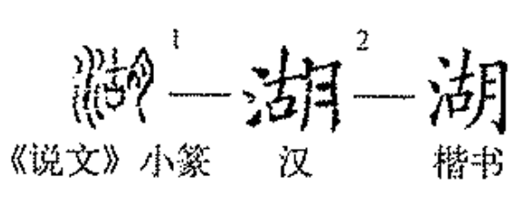 “湖”与“海”在古文字中的意义相反,如果说海是水绕地的话,那么,湖便是土围水。“湖”的本义是指被堤岸高地包围着的大片积水,《说文解字》对此释为:“湖,大陂(bēi)也,从水胡声。”显而易见,“湖”字从月从沽,也根本不是一个形声字。许慎没见过金文的“湖”,故而有此错释。《广雅·释地》说:“湖,池也。”孔颖达疏为:“大泽蓄水,南方名之曰湖。”