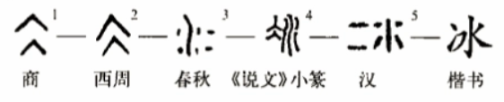 “冰”,象形字。甲骨文的“冰”字,写作“仌bīng”。甲骨文的“仌”字,像严寒之中,水凝结突起的冰块的样子(图1)。隆冬李节,在山间的小瀑布,通常可见到这种棱起的冰形。金文的形体与甲骨文相似,可是到了小篆,却在原形左边又增添了一个“水”字,表示“冰”是由水凝结而成,由此,经由转注演变为个形声字。楷书则将“仌”形简省为两点水的“冫”,遂成为现代汉语中的“冰”字。