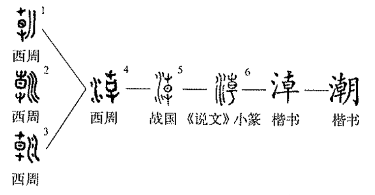 “潮”,金文=(水,海水)+(“朝”的省略,早晨),“朝”,表示早上。表示早晨的海水。造字本义:早晨上涨的海水。篆文承续金文字形。古人称早晨涨的海水为“潮”,称黄昏涨的海水为“汐”。