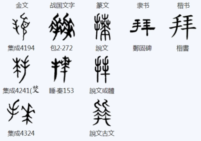 《说文》杨雄说,拜,从两手下也。《礼·郊特牲》拜,服也,稽首服之甚也。《疏》拜者,是服顺也。《周礼·春官·大祝辨九𢷎注》稽首,头至地也。顿首,头叩地也。空首,头至手,所谓拜手也。吉拜,拜而后稽颡。凶拜,稽颡而后拜。奇读为奇偶之奇,谓一拜也。褒读为报,再拜是也。肃拜但俯下手,今时撎是也。振动,战栗变动之拜也。