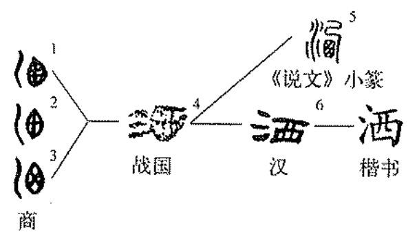 “洒”,甲骨文=(水)+(西,绳线系扎的布包,布团),造字本义:古人扫地时为防止灰尘飞舞,用棉布团吸水,然后甩动布团,让水均匀散落在地上。篆文将甲骨文的布团写成“西”,以致字形难辨。