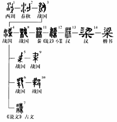 “梁”的本义为平坦之“桥”。三国时曹丕的《燕歌行》:“牵牛织女遥相望,尔独何辜限河梁。其中的“梁”即为“桥”。桥梁隆起而突出,因此,自然界隆起的长条形事物,也称之为“梁”,如“山梁、鼻梁”等。房梁横跨屋面,与凌空架设的桥梁形式上相似,因而也称之为梁,但在古文中多写作“樑”,汉字简化时,一并写作了“梁”。