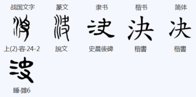 “决”,会意字,“決”的简体字。偏旁“氵”简化为“冫”。依据古人书法省笔简化。夬,是“玦”的本字,表示中断、分别。决,篆文=(水,洪水)+(夬,“玦”,中断),表示洪水将堤岸冲出口子。造字本义:大水冲裂堤岸。