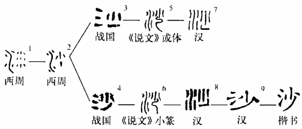 “沙”字在金文中可见,金文的“沙”左边部件为“水”,右边部件为“少”。“少”即在“小”字下加一点指事而成,古汉语中“少”“小”可以通用。“沙”字由少、水会意而成,表示的是水边的小的颗粒石子。小篆的形体基于金文,从水、从少。隶书形体结构与小篆相同,左边的“水”写作“氵”,但含义不变。战国文字形体渐趋统一,易象形为会意。本义为沙。后用为沙地、沙漠及泛指细碎松散之物,皆引申义。又用为河流名、地名等。沙或从“尐”,于义无别。